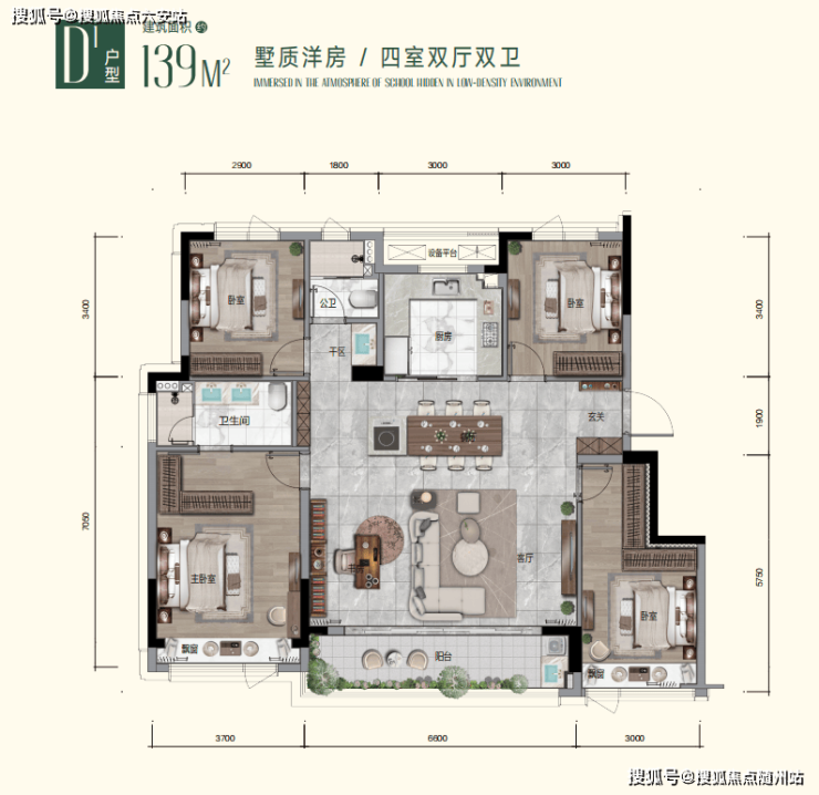 D1户型的优点:四叶草户型,精密独立,四季阳光温暖每寸空间,围合自在阔绰的通厅,形成多元,无界的社交主场,大面宽套式主卧,为主任生活预留更多可能,开放式中岛餐厅,营造现代简约式生活场景。