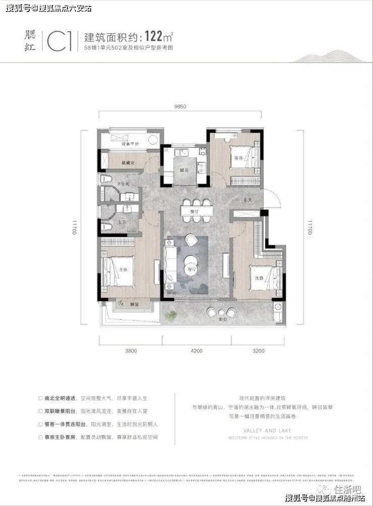 户型点评优势:122㎡的三房两厅两卫设计,留出了独立的玄关收纳空间与落尘区,十分贴心。三个房间分布在三个方向,空间都不显局促,主卧更是自成一体。客厅连阳台,一动一静之间景观尽收眼底。
