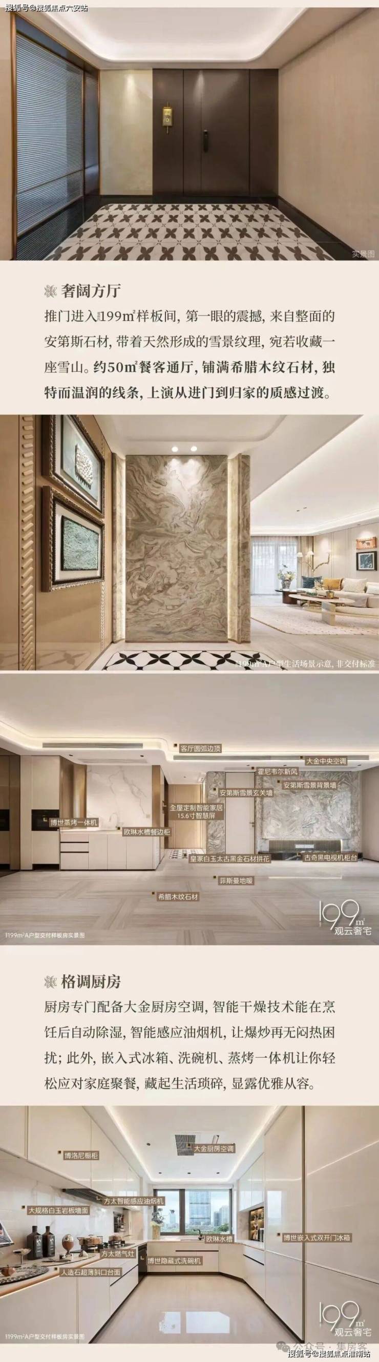 建面约199㎡户型精装风格为白金色调,选用皇家白玉、太古黑金、安第斯雪景、希腊木纹等名贵奢石,巧妙搭配在地面和墙面空间。配置大金中央空调、霍尼韦尔新风、菲斯曼地暖三大件,以及博世、方太、汉斯格雅、杜拉维特等品牌。