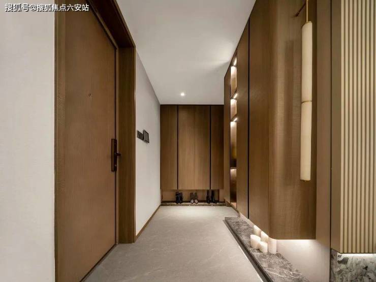 你看,美感拉满的入户大堂,配置有工艺极为复杂的地面瓷砖拼花、雪山银狐岩板的背景墙,以及精美壁灯, 甚至空间立面的每一条分缝线,都是设计师根据空间尺寸进行的划分。