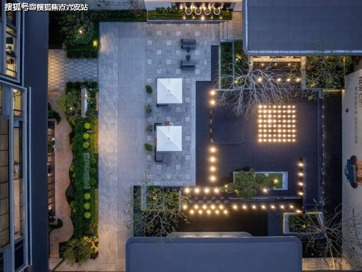 入口两侧油橄榄树姿态优雅,自带松弛感;归家序厅两侧有种植桂花树,隐喻"蟾宫折桂"的祝福;地面铺装芝麻黑花岗岩与福鼎黑花岗岩,不仅沉稳大气还有活泼灵动……