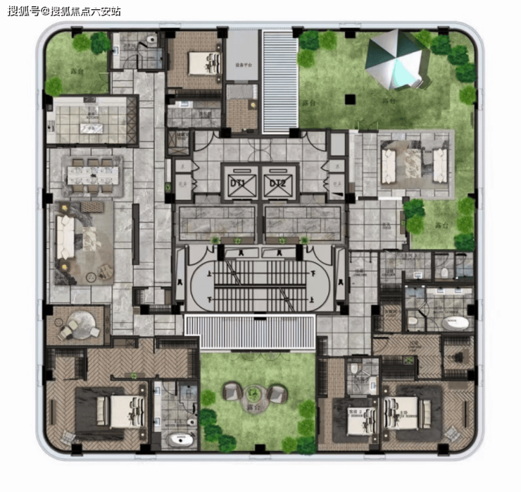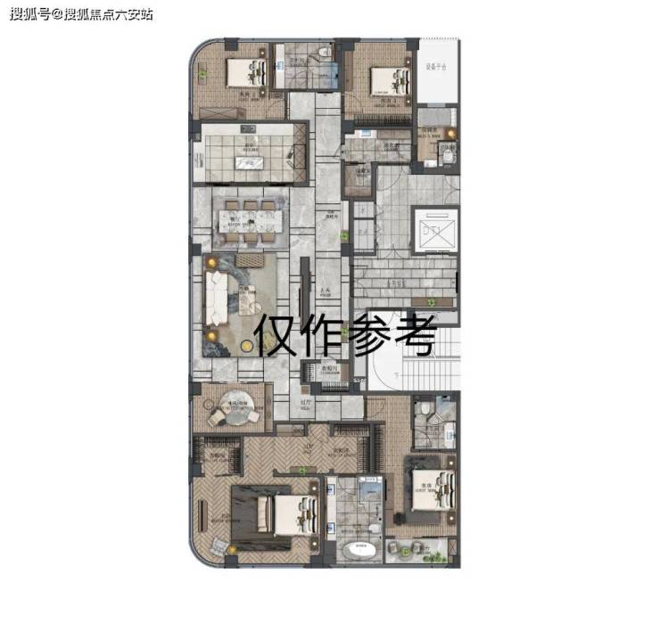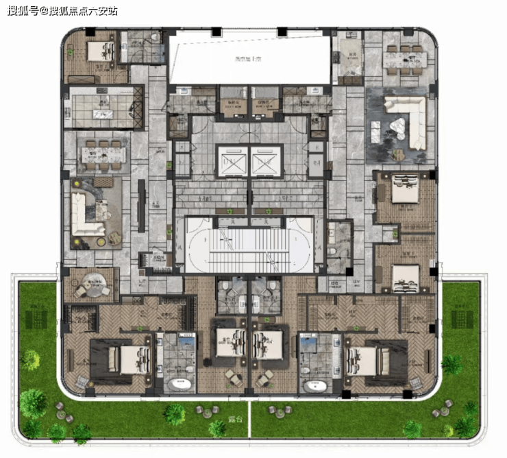 二楼带景观露台,顶楼空间则奢侈到夸张,490m²五房,一层一户送三个露台,比传统的300m²地上三层地下二层的别墅还舒服。因为别墅单层面积80m²,吃个饭楼上楼下跑,这里则是490m²摊在一个平面,因此这类顶楼大平层极度稀缺。