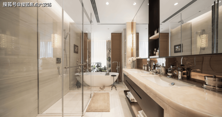 约10㎡的豪华主卫全奢石铺贴,台面超配了玉石,加装了独立浴缸,双台盆设计;外面还有面宽约6.5米的超宽观景阳台,躺在床上就能看风景!