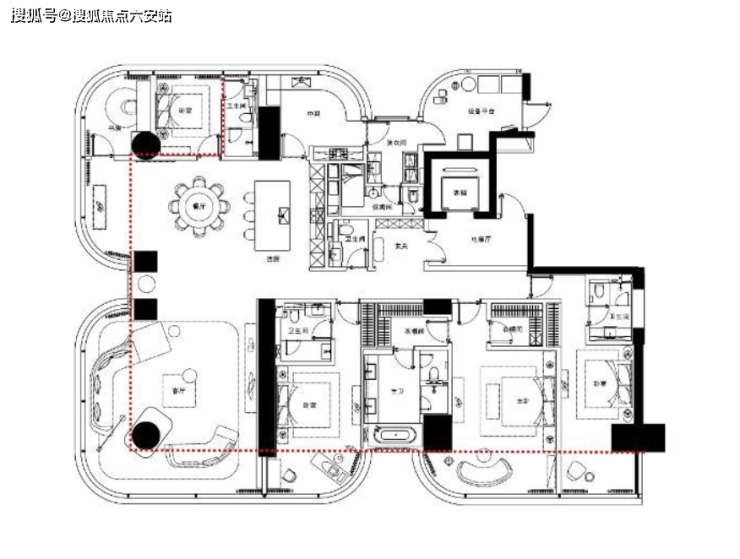做了六房六卫,四套房,每个房间尺度都很阔绰。3.8米层高,24米南向开间,餐客厅近200m²。