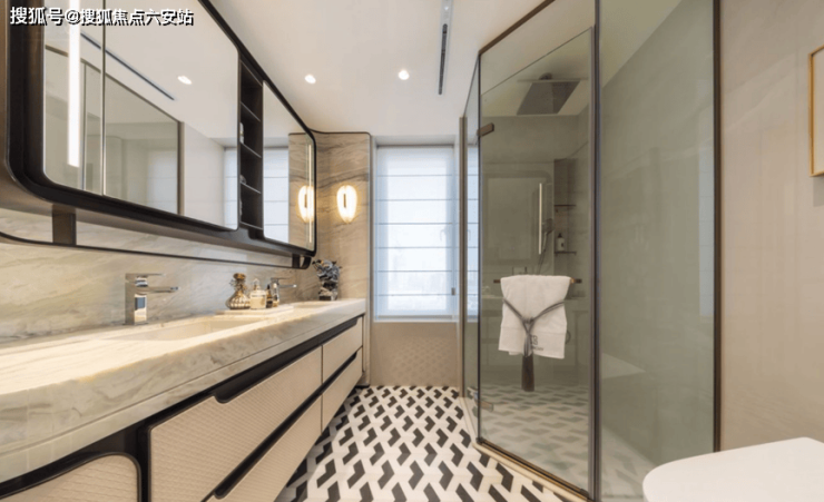 主卫更是下了血本:KA浴缸、双台盆、大理石拼花地面,还有独立的美妆冰箱。女主人看了很难不心动。