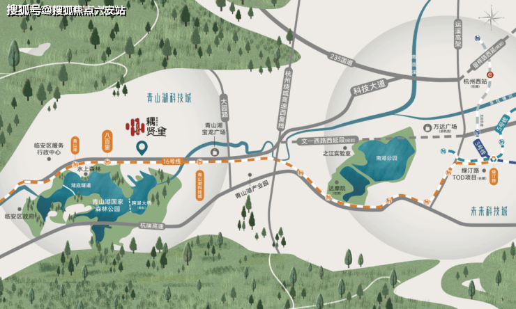 「青山湖科技城」青山湖科技城作为城西科创大走廊西门户,拥有政府强劲的政策及产业导入,同时拥有距离杭州便利的杭临交通优势:科技大道一脉贯通未来科技城核心区;通过杭瑞高速,快捷通达全省;距离地铁16号线八百里站步行距离约1.6km,7站地铁可到达绿汀路站,与地铁3号线、5号线无缝换乘,通达全城;杭州西站作为杭州第三大门户交通枢纽,集高铁、机场快线、地铁、公交车、出租车、社会车辆等多种交通方式于一体的巨型TOD,将通过5条高铁及4条城市轨道线,提速与长三角地区间的联动发展,吸引产业、资本流、信息流资源在此倾斜。