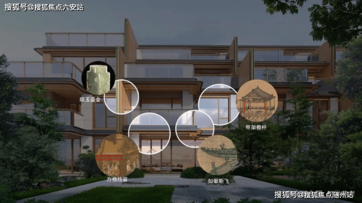 在建筑上,如玺华院以天青色陶板,致敬杭州的宋韵文化,演绎“雨过天青云破处”的意境;观锦宸樾府用伊朗红洞石,唤起当地人对临安鸡血石文化的情感共鸣,呼应“鸡血一滴避邪气,得此宝贝最吉祥”的民间佳话;运河樾用蓝色景泰蓝搭配弧形陶板,再现运河的波光,诠释“春来江水绿如蓝”的江南意境。