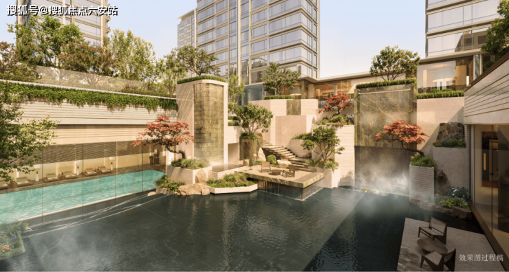 首先,大门处打造了一个“水上”迎宾通道,灵感源自曼谷嘉佩乐酒店和纽约安缦酒店,在长约150米的恢弘界面上,顽石、叠水、绿植、艺术雕塑高低错落分布,还有一面叠瀑从建筑立面里垂延出来,气派十足。