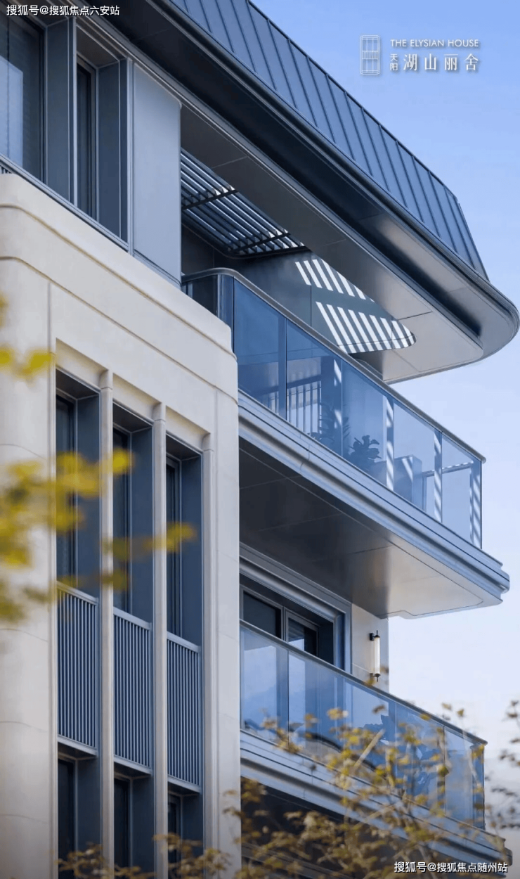 在建筑立面的打造上,湖山丽舍采用经典三段式构图的建筑立面,将极简线条转化为流动的几何韵律,同时提炼新新饭店的孟莎式坡顶,采用创新镂空设计,以及经典的竖条形窗设计,赋予建筑现代摩登艺术的作品气韵。