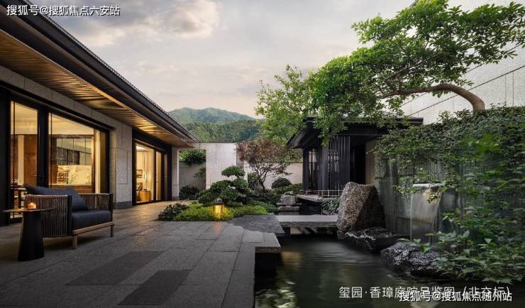 玺园·香璋景观由绿城环境宋淑华设计,以浙派园林风格为基底,汲取《溪山行旅图》《西园雅集图》灵感,以宋代长流涧串联整个景观轴线,并以绿植、景石等风景要素点缀,给人“如在画中游”的情景体验。