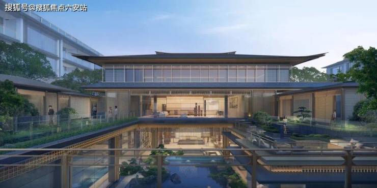 建筑立面:古今交融的诗意表达:外立面以香槟金铝板 为基调,搭配蓝眼睛石材与玻璃幕墙,融合传统歇山重檐、纳福悬鱼等元素,既保留宋式建筑的对称美学,又赋予现代建筑的轻盈通透。合院组团采用 三面庭院设计 ,L型景观面与环绕式檐廊,将超山梅影、丁山湖光引入每一扇窗景!