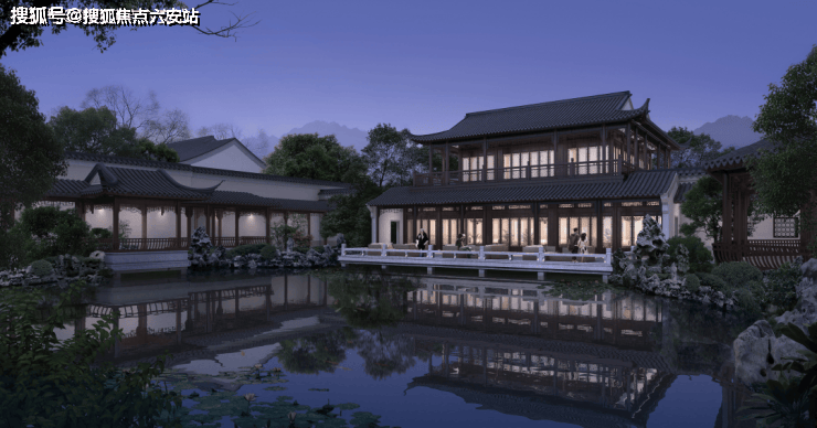 江南园林甲天下,苏州园林甲江南,比如像我们现在看到的园林布局,就是经典的苏州园林景观,讲究引水入园。造景围绕着这片水景展开,空间上比较有层次感。近景是流水、堆石,中景是连廊、假山,远景是中式合院的院墙、屋檐。