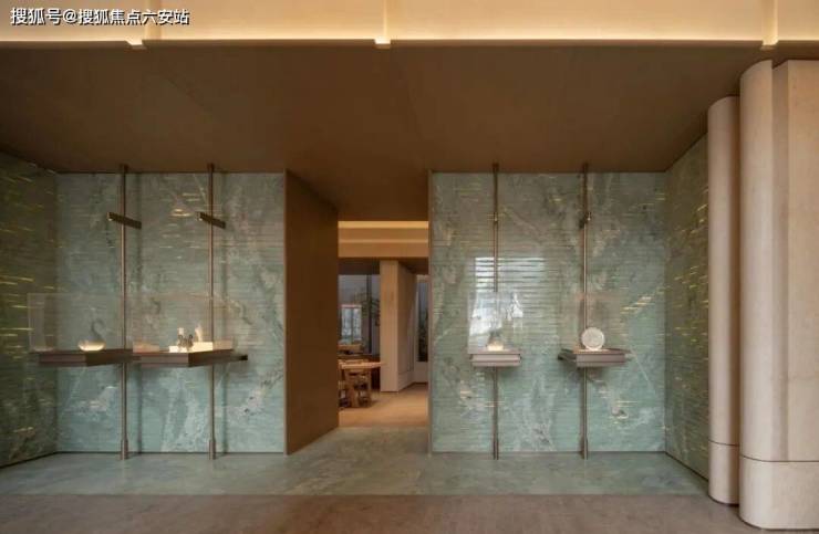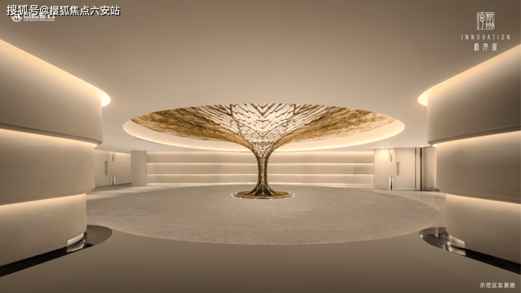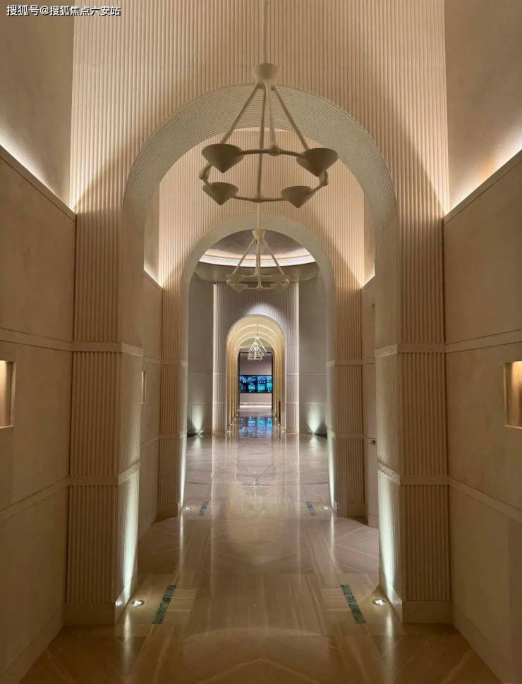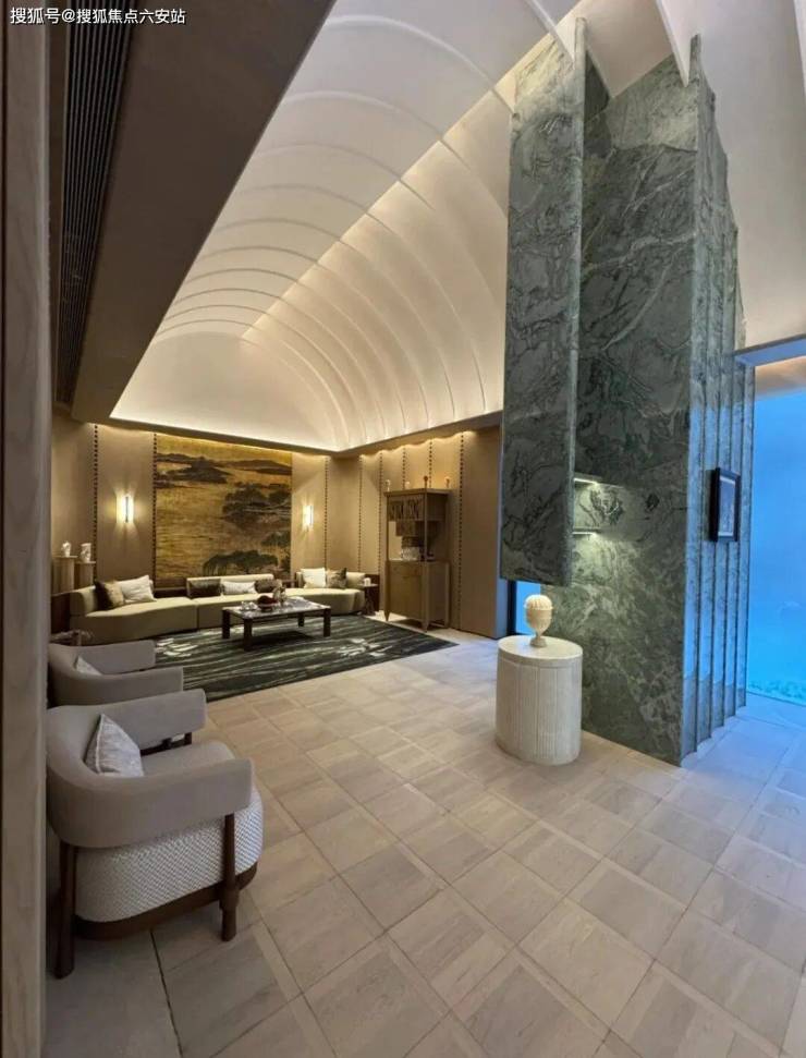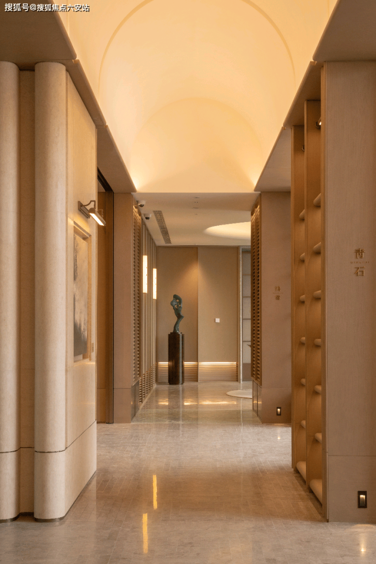 杭序府匠心独运,打造别具一格的「溪谷」门厅,一眼难忘,令人印象深刻。灵感源自九溪烟树的幽深谷景,采用曲面石材景墙搭配香槟金属线条,宛如潺潺溪水般灵动。上方矗立一座气势恢宏的扇形华盖,名为【沧浪华盖】,其错落有致的造型自然勾勒出入门的峡谷景观。流畅的宽阔弧线,起始于主入口处月光米黄的石材(主入口两重门厅的景墙,就用掉了近1000m³月光米黄石材)双曲面墙体,以其独特的气势,强势横跨整个空间。