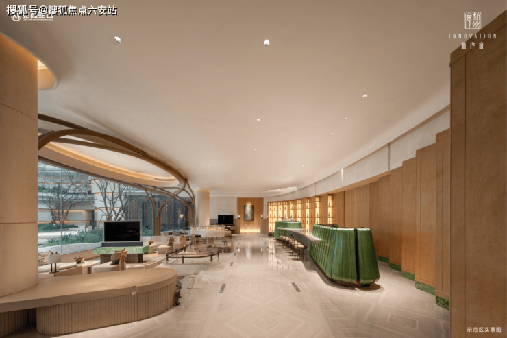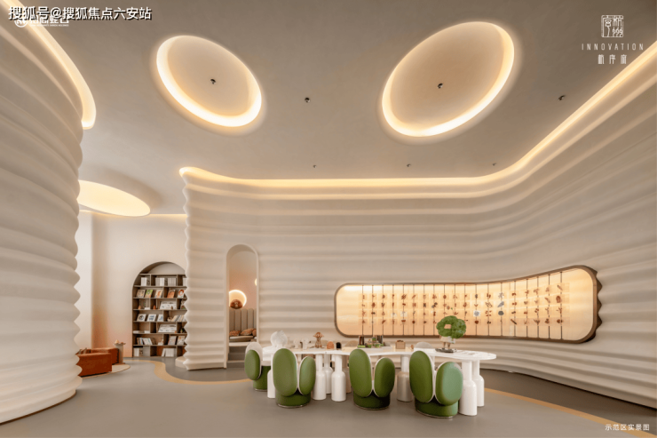 架空层精心打造,携手西泠印社,以书吧、休闲区、会议室为核心文化载体。特色拱圈长廊巧妙连接两侧空间,墙面装饰或为实用书架,或为璀璨发光的石材,亦或为营造度假气息的精致格栅,营造出多元化的空间体验。同时,注重屋顶与地面软装的和谐搭配,提升整体空间美感和舒适度。