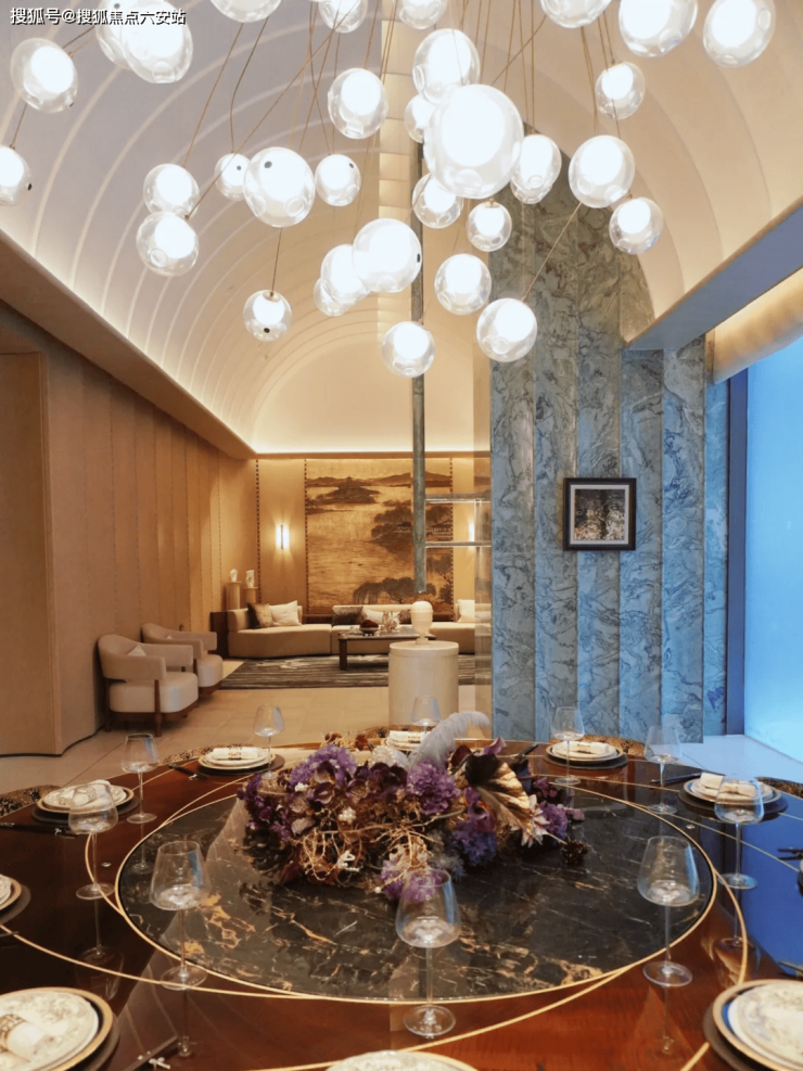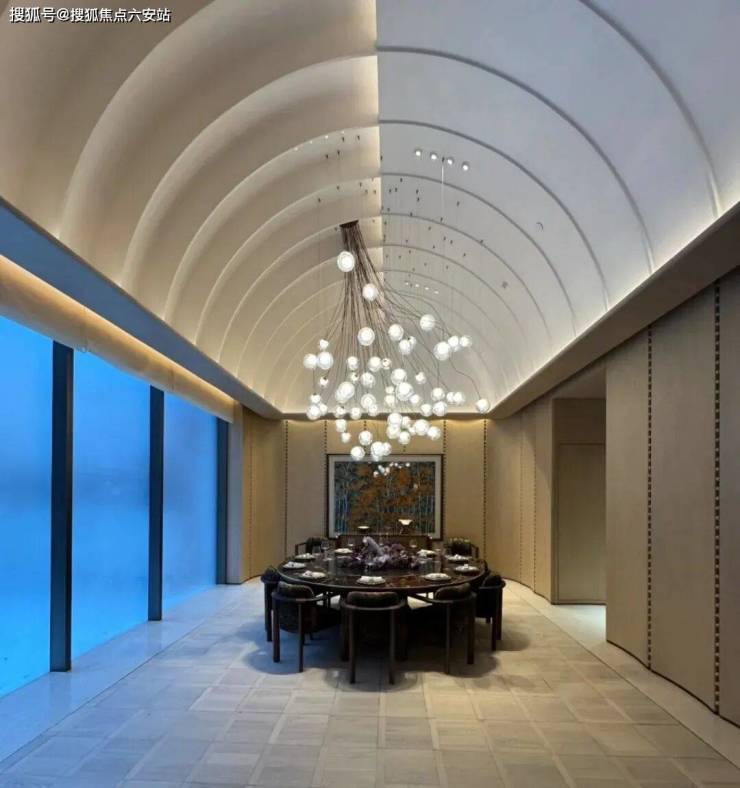 私宴,以撞色绿色石材打造的景墙巧妙划分出休憩与用餐区域,既巧妙掩盖了空间中的柱子,又破解了宽阔空间的单调感。拱券天花与墙面波浪板的和谐呼应,既彰显了空间布局的层次感,又打破了传统对称的僵化。淡雅的硬装色调搭配深邃的中古家具与软装,简约而不失格调,视觉体验清新自然,避免了过度夸张。