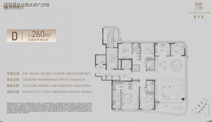 260㎡的五室户型,堪称杭序府的「王者」之作,彰显尊贵仪式与磅礴大气。入门即见气势非凡的十字圆厅,巧妙地将各空间串联,同时营造出自然私密氛围。南向的两个套间设计宽敞舒适,尤其是主卧,配备超大休息区、衣帽间以及朝南卫生间。更令人叹为观止的是270度转角玻璃构成的超大客餐厅,面积高达约76平方米,搭配约14平方米的阳台,带来无与伦比的视觉震撼。