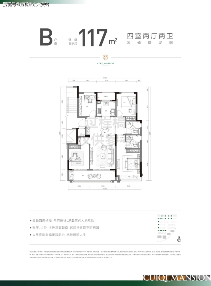 97㎡三房两卫:三开间朝南+双面采光阳台,主卧套房设计,套内面积约100㎡。