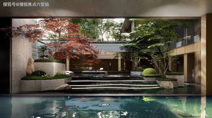 社区园林:立体洄游园林(下沉庭院+镜面水院+阳光草坪),35%绿化率四季有景。