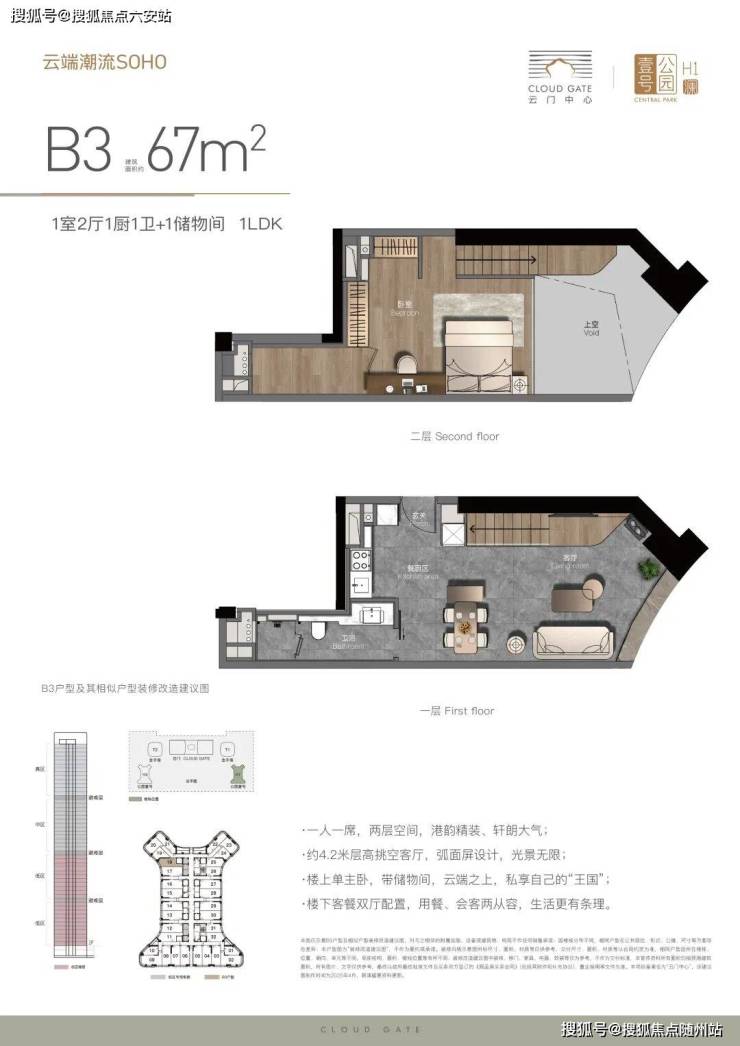 云门中心LOFT公寓的空间设计极具特色,约4.2米层高创新设计,打造出通透大气的空间感。产品设计充分考虑了空间利用的灵活性和功能性,如B1户型约70㎡两室两厅一厨一卫设计,约4.3米面宽,全幕墙落地窗,光景无限,可俯瞰云城;约4.2米层高挑空客厅,营造轩朗大气的空间感受。