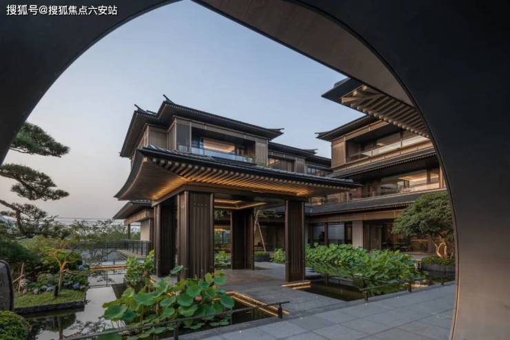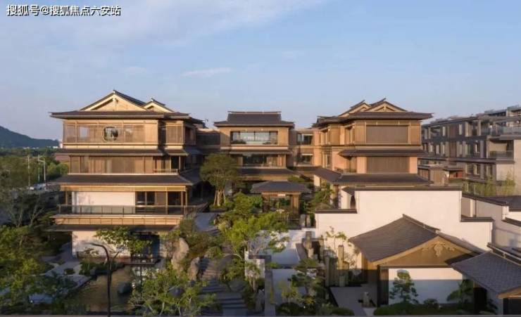 建筑外立面以香槟金铝板为基调,搭配蓝眼睛石材与玻璃幕墙,融合传统歇山重檐、纳福悬鱼等元素,既保留宋式建筑的对称美学,又赋予现代建筑的轻盈通透。合院组团采用三面庭院设计,L型景观面与环绕式檐廊,将超山梅影、丁山湖光引入每一扇窗景。