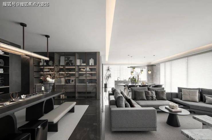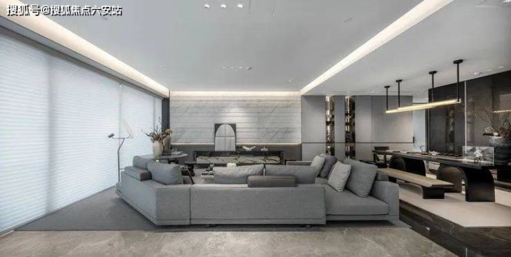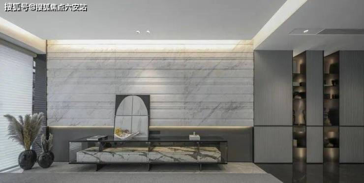 空间在材质搭配上,也是极尽雅奢可能。鱼肚白岩板打造的大岛台,营造温情的社交一隅;木饰面与金属软硬质感的碰撞,有序的墙面分割把握了整体空间的节奏感;双背景墙分别由鱼肚金岩板和劳伦黑金色系展墙组成彰显奢华。