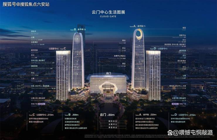 这座以"云门"为意象的现代主义建筑群,正如其名般凌驾云端——320米的金手指T1如巨擘直指苍穹,300米的T2双子塔以钻石切割立面辉映天光,213米的公园壹号双塔犹如水晶方碑矗立云城之芯。14层云门建筑以"数字之门"造型,将成为杭州面向长三角的科技迎宾厅。