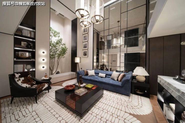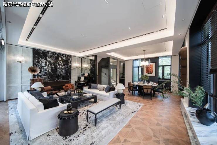约212㎡户型也是一样的“高门华屋”,经典的外观下,一楼客餐厅已迭代为三面采光、270°的连续落地长窗,私梯上下穿梭,挑高地下空间也引入阳光。