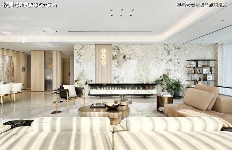 而李嘉诚御用设计师梁景华的390m²正厅,电视背景墙是意大利潘多拉奢石,甚至延伸到了空中花园,像是飞舞在皑皑雪山中的霓虹霞衣,在皓白的雪花上勾勒出写意的纹理,灿若繁星。