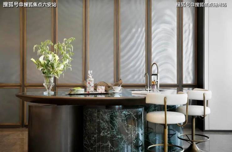385m²钻石厅CCD郑忠沿用了梅西家同款的FENDI白大理石做了一道圆弧形背景墙,转角是工艺复杂的波浪纹,不仅造型独特,而且损耗极高,配合火红的壁炉、米白的钢琴键沙发,别致的水滴形吊顶与弧形PRADA绿奢石岛台交相呼应,将客厅的艺术氛围升华到了极致。