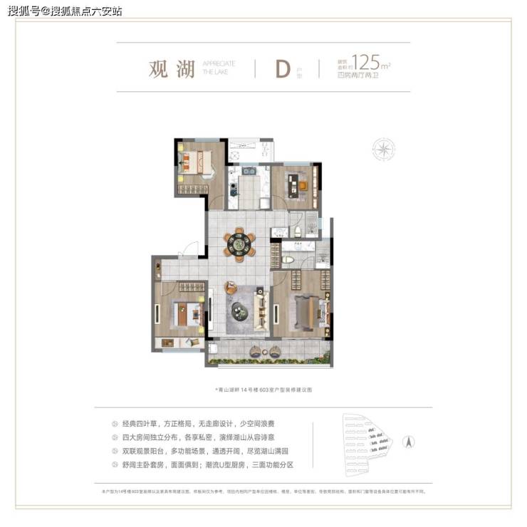 125㎡和140㎡的四房户型就更宽敞了,采用经典的“四叶草”布局,四个房间独立分布,私密性很好。