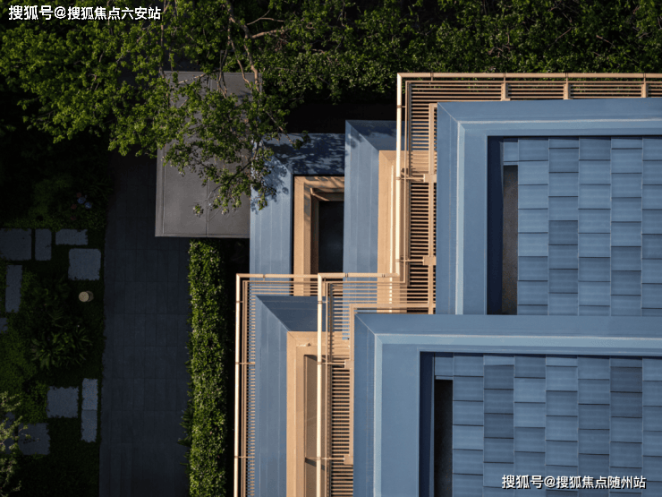 项目以卓越的窗墙比和大面积灰蓝玻璃,极简化打造光影天幕,倒映自然之境 ;在 东方屋檐和宋韵飞檐之上,融揉现代审美工艺 ,诠释当代合院的东方大美;更臻选 靛蓝色的陶瓦,原创蓝金坡屋顶 ,掀起杭州合院立面的新序章。