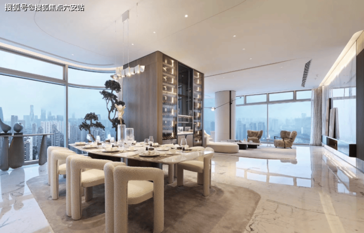 携手英国福斯特事务所(Foster+Partners)与荷兰UNStudio,以“悬浮水晶”为灵感,外立面采用2.4米超白玻璃幕墙+鱼肚白石材,打造建面约375-650㎡云端大平层。270°环幕采光、18米挑高剧院式大堂、流线型雨棚设计(可同时停驻18辆劳斯莱斯),获评“LEED+WELL社区双金认证”。