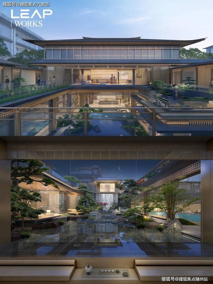 项目以宋代《营造法式》为蓝本,由LEAP绿城利普团队操刀设计,将传统东方韵味与现代建筑语言完美融合。合院与叠排产品错落有致,合院采用重檐歇山顶设计,庄重大气;叠排则运用平缓飘逸的瘦金披檐,兼具遮阳防潮功能。
