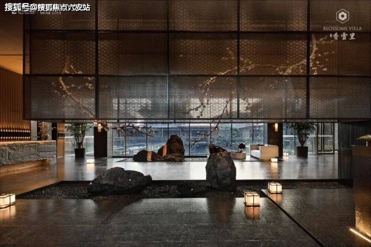 园林设计以中央山水景观轴为骨架,构建“一轴一带八景十巷”的多进式体验。入口处50米跨度大门以亚马逊黑奢石打造墙面,对景墙以亚马逊绿奢石镶嵌金石,刻绘项目Logo与六瓣梅花图腾,彰显沉静尊贵气质。