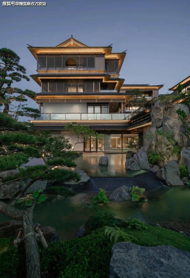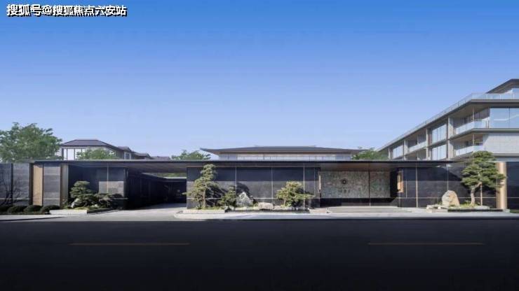 建筑立面:以香槟金铝板为基调,搭配蓝眼睛石材与玻璃幕墙,融入歇山重檐、纳福悬鱼、黛墨青瓦等传统元素,古今质感碰撞,阳光下勾勒“山水天幕相融”的意境。