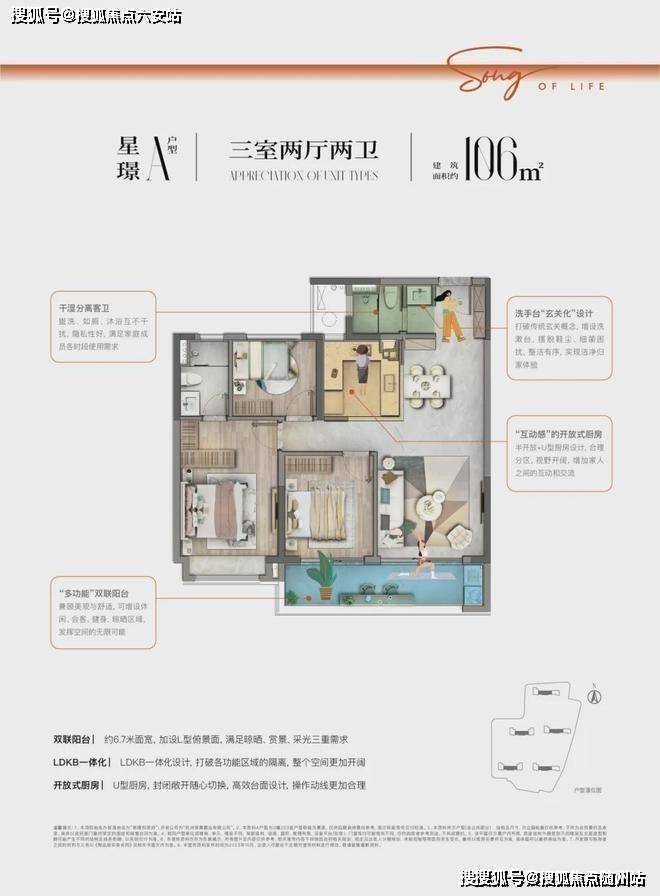 约106㎡户型点评:双联阳台约6.7米面宽,加设L型俯景面,满足晾晒、赏景、采光三重需求,LDKB一体化设计,打破各功能区域的隔离,整个空间更加开阔,开放式厨房 U型厨房,封闭敞开随心切换,高效台面设计,操作动线更加合理。