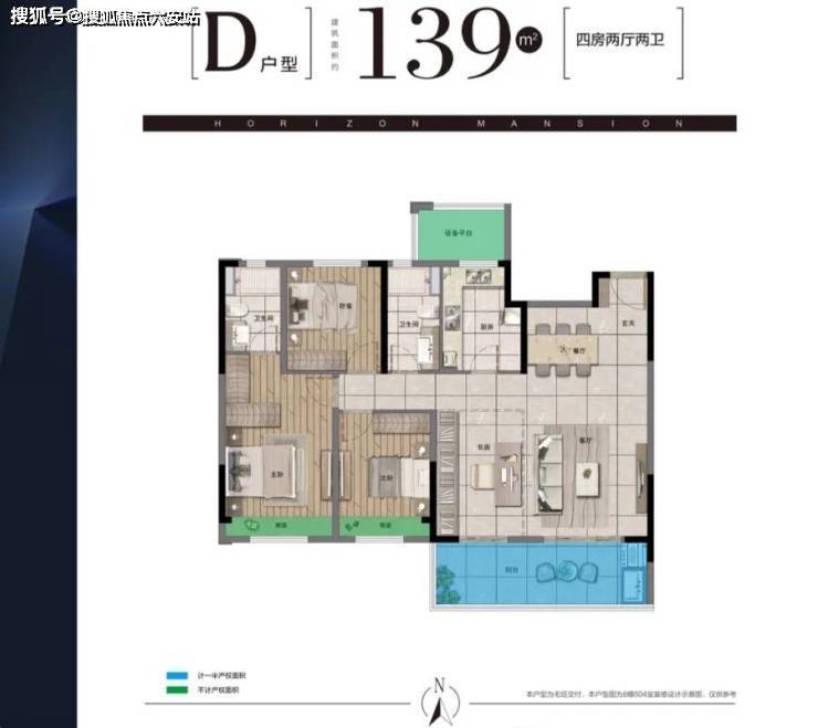 建筑面积约139㎡户型,客餐通厅连接近6.7米南向双阳台,推窗即景,且带南向双飘窗,保证四开间朝南的宜居设计。