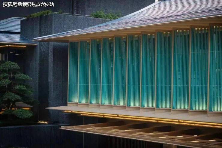 建筑立面采用宋代歇山顶样式,转译为深远的挑檐,清雅内敛,尽显当代气质。大尺度巨幕玻璃窗镶嵌金色铝线条,光影交错间,自然美景与建筑完美融合,呈现一幅幅动人的生活画卷。