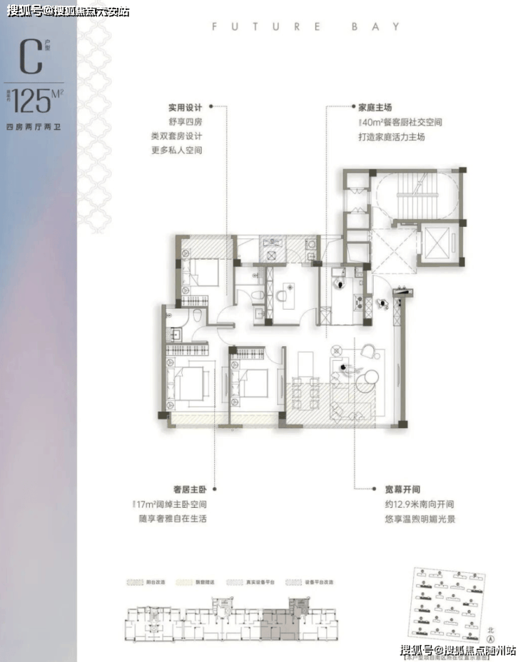 建面约125㎡户型:四房两厅两卫:南北通透,类“一户一梯”设计,增强了归属感与私密性,入户空间可安置童车、鞋柜等。该户型是小面积真边套四房,卧室面宽尺度优越,四开间朝南,约12.9米南向面宽,南向大横厅开间约6.4米,餐客厅面积约40㎡。