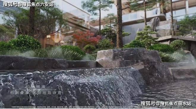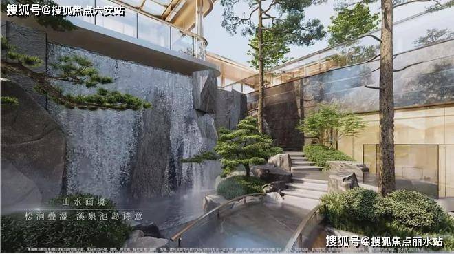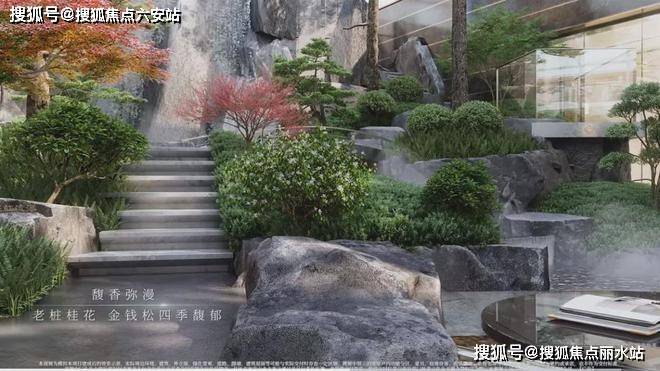 绿城在庭院里还藏了一个流水跌瀑,用拙朴的老皮石模拟天然的崖壁,加上山石错落叠放,水瀑落下,飞珠溅起,有种“断山疑画障,悬溜泻鸣琴。”的意境。