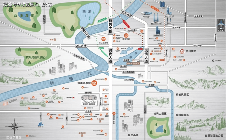 • 快速路:时代大道高架(15分钟直达滨江)、风情大道(双向6车道)、亚太路主干道,30分钟通达萧山机场。