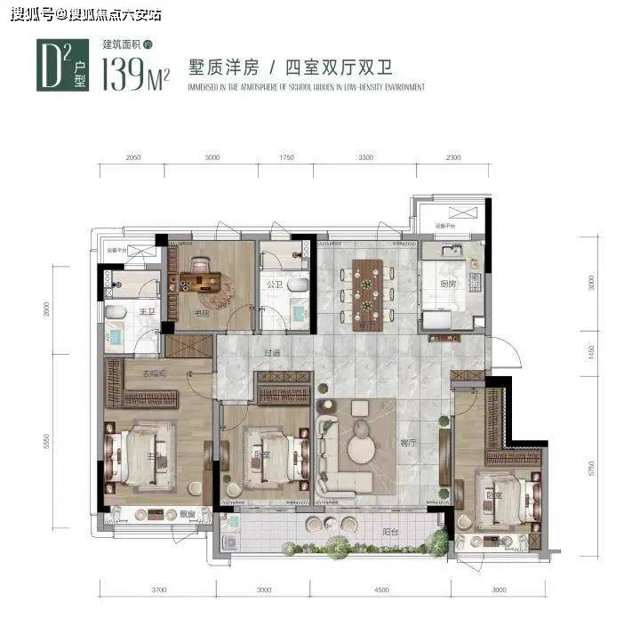 洋房的户型就更豪横了。建面约139㎡的大四房,四开间朝南,主卧面宽约3.7米,另外三个房间的面宽都达到约3米,尺度非常舒适,客厅更是“中轴式布局”,双厅一体,南北通透,将客厅、餐厅融为一体,南北风景一览无余。