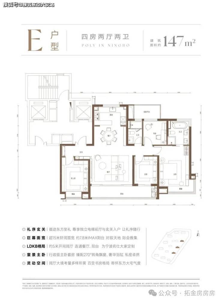 建面约147㎡E户型,奢阔四居,主卧套房 + IMAX级观景阳台,定义高阶改善标准。