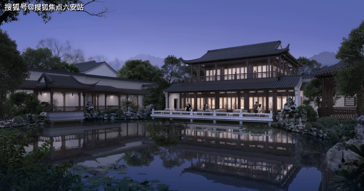 江南园林甲天下,苏州园林甲江南,比如像我们现在看到的园林布局,就是经典的苏州园林景观,讲究引水入园。造景围绕着这片水景展开,空间上比较有层次感。近景是流水、堆石,中景是连廊、假山,远景是中式合院的院墙、屋檐。
