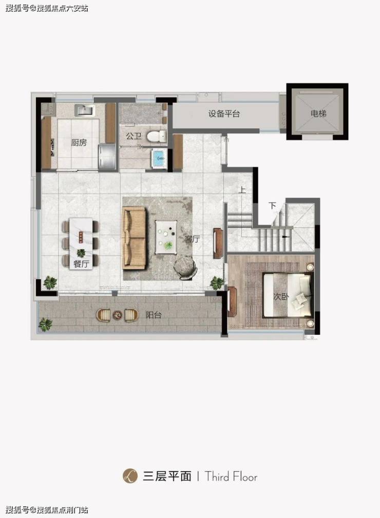 下叠四房两厅三卫的设计。一层南向整体面宽约10.8米,餐客厅一体,连通约7.2米的长阳台,大横厅与落地窗的搭配,增加了室内空间与庭院的互动。
