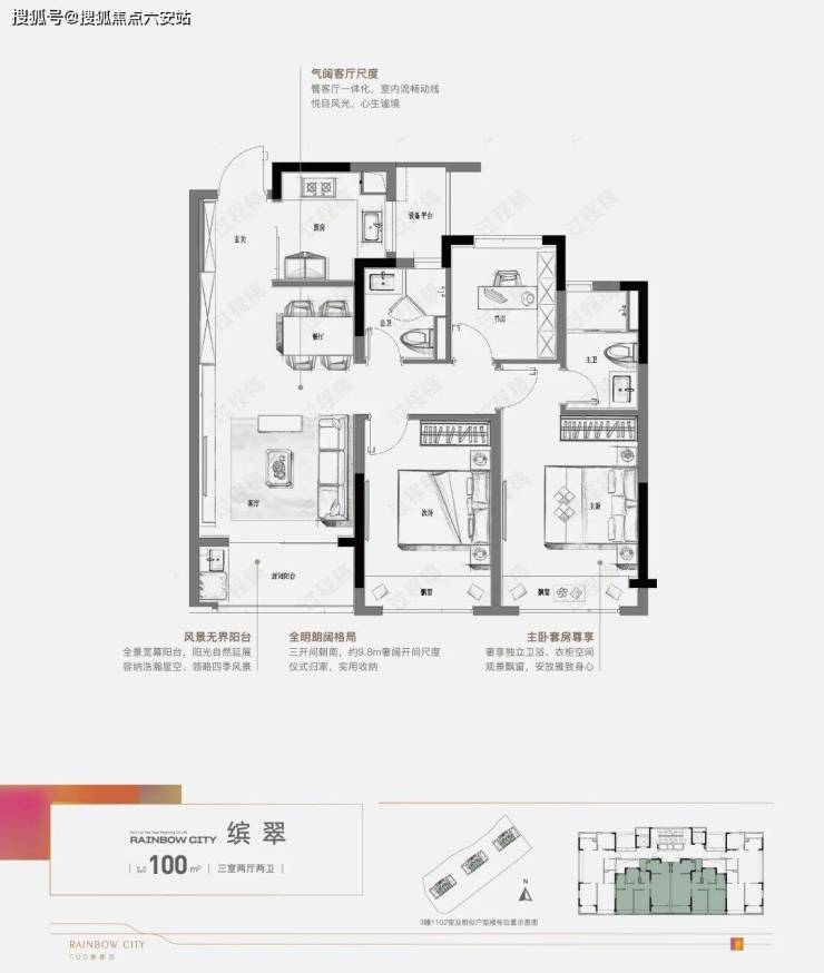 当红加推的2#央境楼座,建面约100㎡户型:采用经典的三开间朝南设计,客厅连接南向阳台,两个卧室均配备大飘窗,保证了全屋充沛的采光。一体化的餐客厅设计,让空间更显开阔。