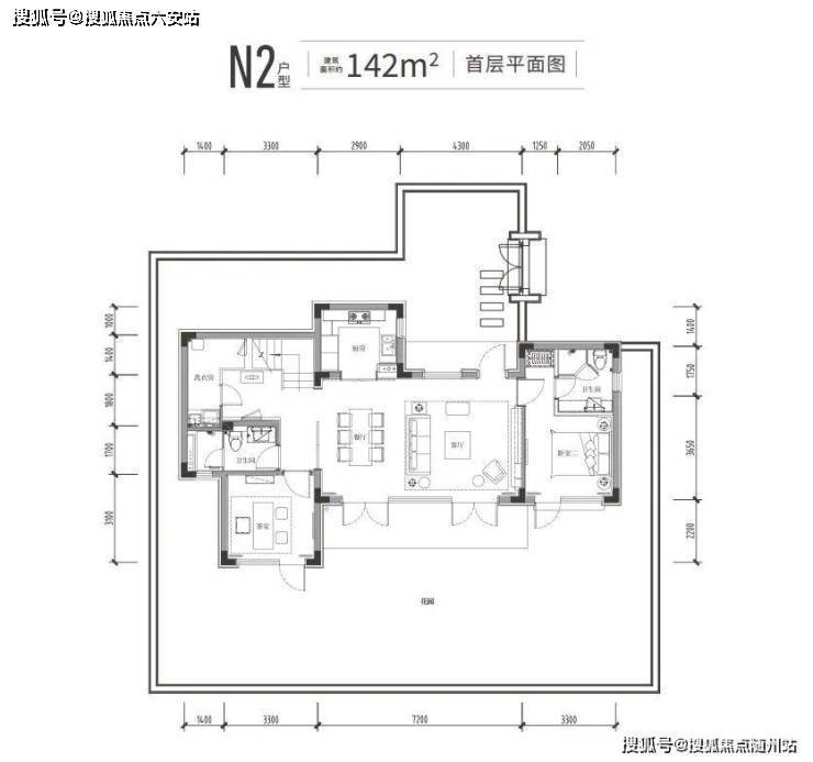 142㎡户型为例,面宽约15.2米,标准4房4卫。一楼是约7.2米长的双面采光大横厅,除了老人套房,还有个向院子伸出的“X空间”。