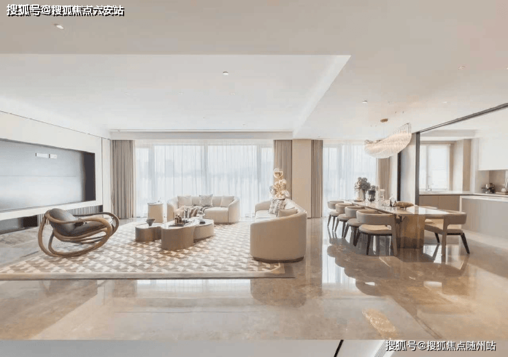 室内空间,更像是一个高级藏品艺术馆,由大师郑世樑先生执笔,以LDK无界空间分割与270°无柱宽幕设计,在拉阔空间视觉气场的同时,又与外界园林景观恣意互动,启幕剧场化日常。