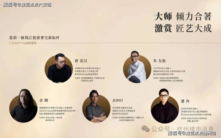 力邀近境制作创始人唐忠汉、TCD²平仄设计创始人朱友庭、木杉景观创意总监JONO、名谷设计创始人潘冉、青墨建筑设计创始人余刚5位设计名家重磅携手。集匠艺之大成,共筑金沙湖当代奢宅新标杆。