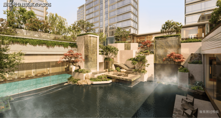 约150米超长的城市界面,揉融约36米进深的震撼镜面大水景,和悬垂的流瀑,结合建筑立面打造多层次悬浮树池、跌水、瀑布,仿佛一层透明的帷幔,将外界的纷杂悄然滤去,完成让心瞬间沉静下来的“抵达艺术”。